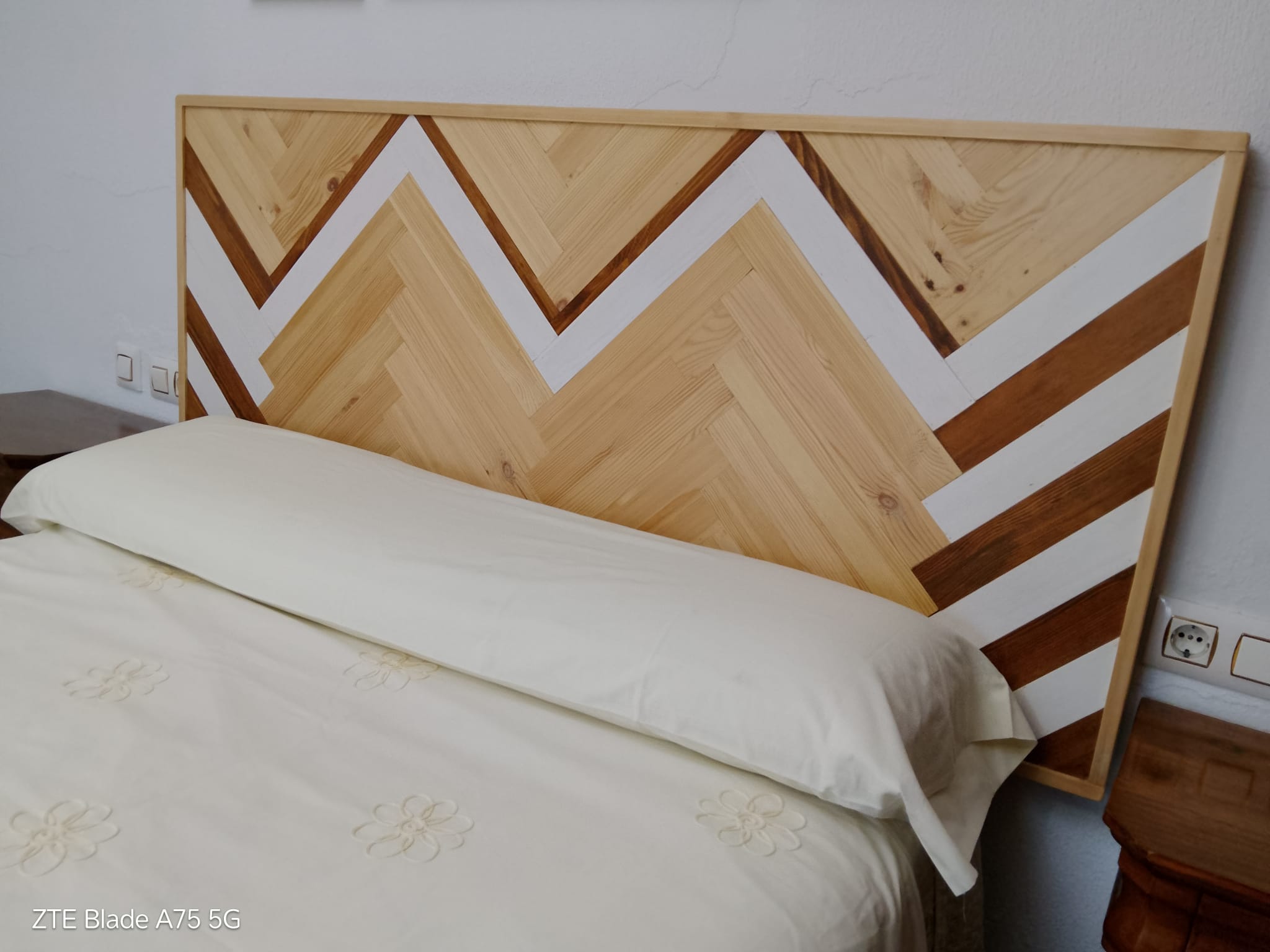 El cabecero Sancti Petri es una pieza artesanal única, elaborada con un diseño geométrico en tonos madera, blanco y turquesa que aporta carácter y calidez a cualquier dormitorio. Su patrón en forma de flechas convergentes crea un efecto visual moderno y equilibrado, ideal para quienes buscan decorar su espacio con estilo propio.